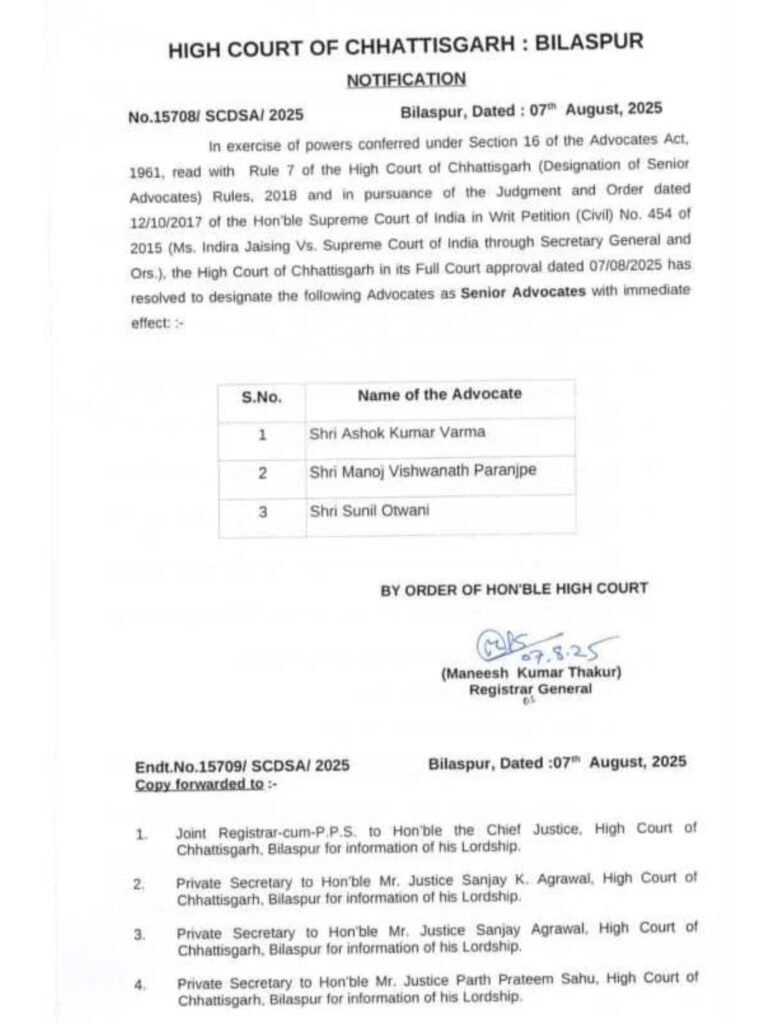 छत्तीसगढ़:– हाईकोर्ट ने राज्य के तीन वरिष्ठ और प्रतिष्ठित अधिवक्ताओं को “सीनियर एडवोकेट” की उपाधि से अलंकृत किया है। यह नामांकन एडवोकेट्स एक्ट, 1961 की धारा 16 तथा 2018 के प्रावधानों के तहत किया गया है।