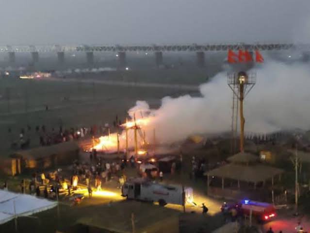 उत्तर प्रदेश :– प्रयागराज में चल रहे माघ मेला के एक शिविर में अचानक भीषण आग लगई। शुरुआती जानकारी के मुताबिक, आज मंगलवार शाम को सेक्टर 5 स्थित मेला क्षेत्र के एक शिविर में आग लगने से भगदड़ मच गई। आग की लपटे देख लोग वहां से भागने लगे। आनन-फानन में सूचना मेला प्रशासन तक पहुंचाई गई, जिसके बाद मौके पर पुलिस और अग्निशमन दल के कर्मी पहुंचे। राहत और बचाव कार्य जारी है। फिलहाल किसी के हताहत होने की खबर नहीं है।