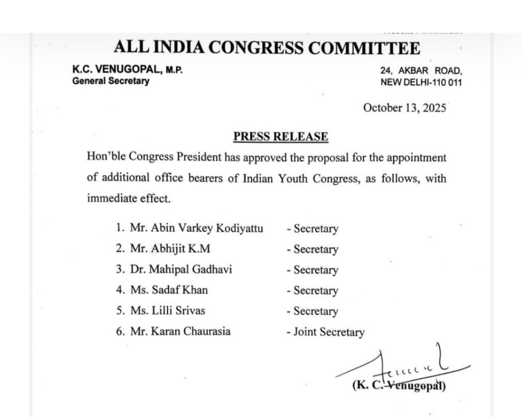 Home » युवा कांग्रेस के अतिरिक्त पदाधिकारियों की नियुक्ति, देखें आदेश…