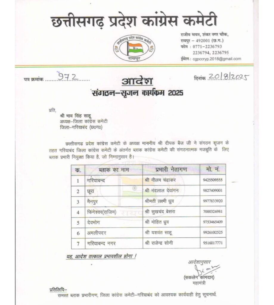 छत्तीसगढ़ :– प्रदेश कांग्रेस कमेटी ने संगठन सृजन कार्यक्रम 2025 के अंतर्गत गरियाबंद जिले में ब्लॉक कांग्रेस कमेटियों को और मजबूती देने के लिए नए ब्लॉक प्रभारियों की नियुक्ति की है। प्रदेश अध्यक्ष दीपक बैज के निर्देश पर जारी आदेश में कुल 7 ब्लॉकों के लिए प्रभारियों का दायित्व सौंपा गया है।