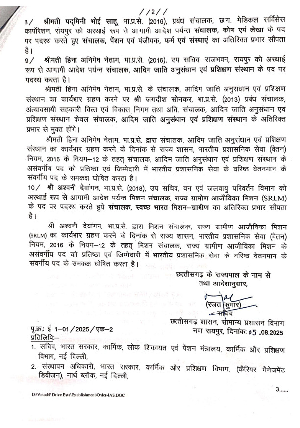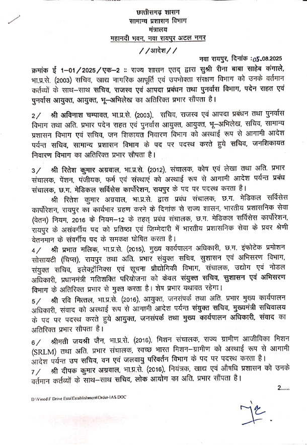 रायपुर:- राज्य सरकर ने बड़ी संख्या में IAS अफसरों की जिम्मेदारी में बदलाव किया है। सीपीआर रवि मित्तल को अहम जिम्मेदारी सौंपते हुए संयुक्त सचिव मुख्यमंत्री सचिवालय बनाया गया है। उनके पास आयुक्त जनसंपर्क व मुख्य कार्यपालन अधिकारी संवाद की उन्हें अतिरिक्त जिम्मेदारी रहेगी।