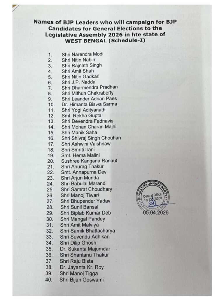 पश्चिम बंगाल :–: विधानसभा चुनाव को लेकर भाजपा ने अपने स्टार प्रचारकों की सूची जारी कर दी है, जिससे राज्य में चुनावी माहौल और गरमा गया है। पार्टी ने इस सूची में कई बड़े राष्ट्रीय नेताओं को शामिल किया है, जिनमें शीर्ष नेतृत्व के साथ-साथ केंद्रीय मंत्री और प्रमुख चेहरे शामिल हैं, जो राज्यभर में रैलियां और जनसभाएं कर पार्टी के पक्ष में माहौल बनाएंगे।