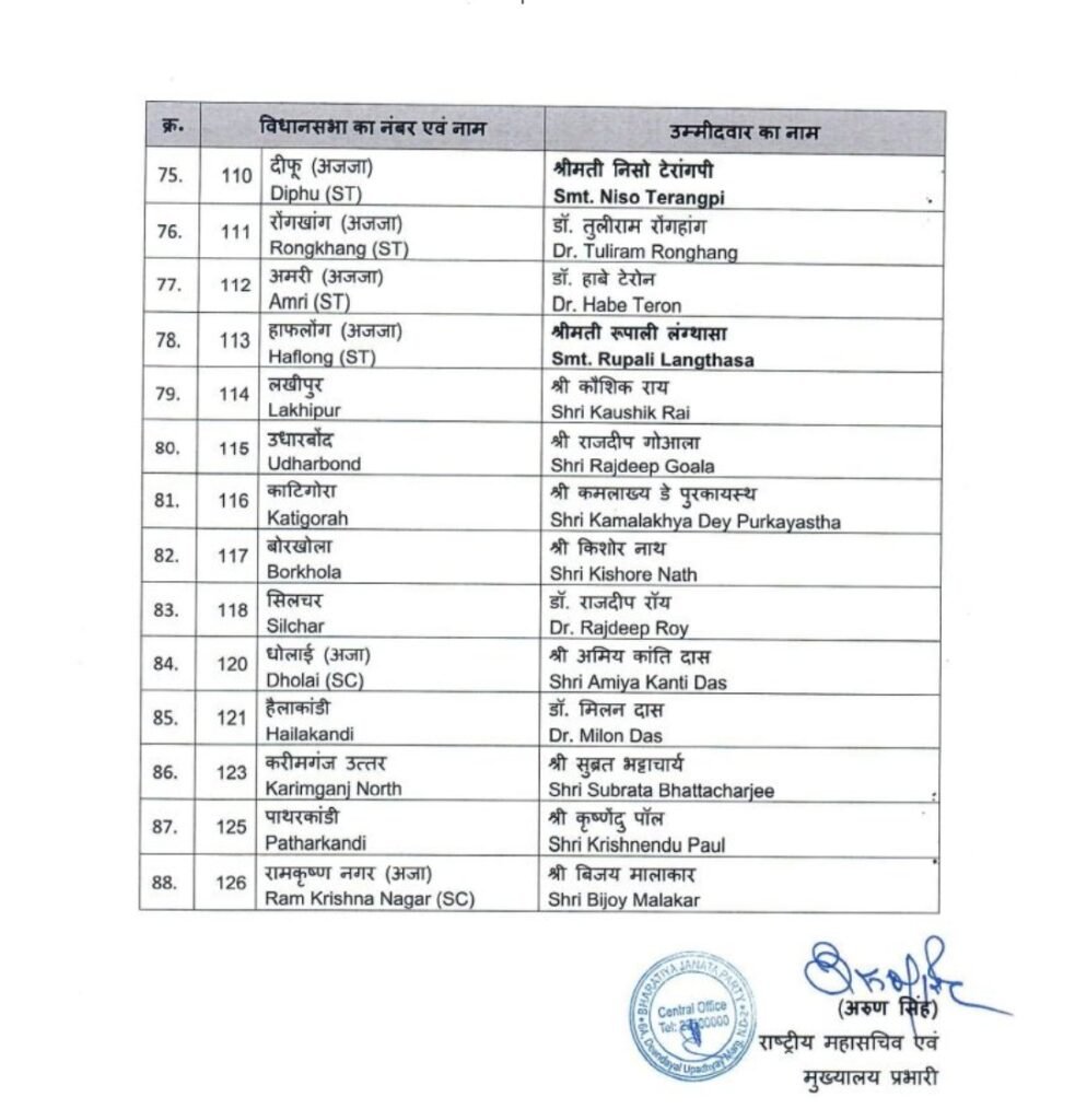 नई दिल्ली:– BJP ने असम विधानसभा चुनावों के लिए 88 उम्मीदवारों की पहली सूची जारी की। CM हिमंत बिस्वा सरमा जालुकबारी से चुनाव लड़ेंगे; प्रद्युत बोरदोलोई को दिसपुर से चुनाव लड़ने का टिकट मिला है