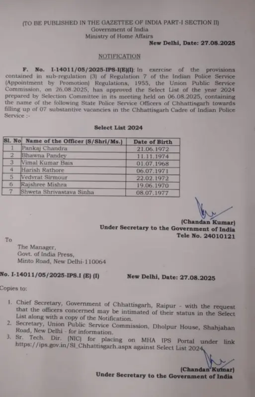 रायपुर :- छत्तीसगढ़ राज्य पुलिस सेवा के 7 अधिकारियों को भारतीय पुलिस सेवा कैडर में पदोन्नत किया गया। गृह मंत्रालय ने इसकी आधिकारिक अधिसूचना जारी कर दी है।
