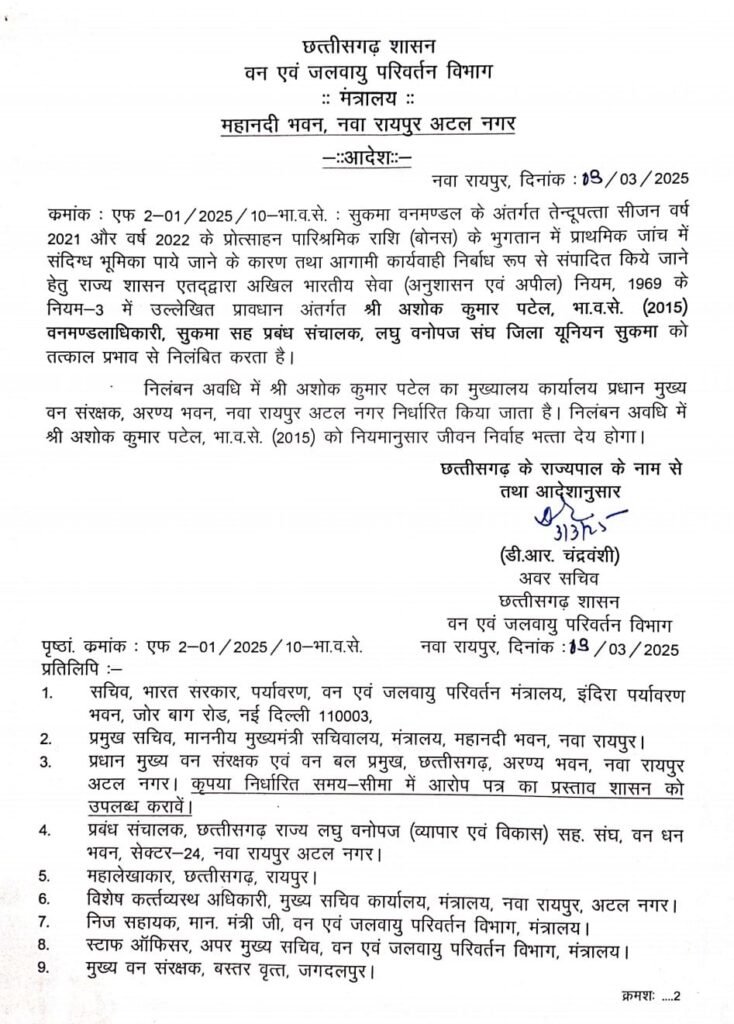 अशोक कुमार पटेल डीएफओ, सह प्रबंध संचालक, लघु वनोपज संघ जिला यूनियन सुकमा में पदस्थ थे। जिसके बाद अब उन्हें निलंबन की अवधि तक प्रधान मुख्य वन संरक्षक नवा रायपुर में भेज दिया गया है।