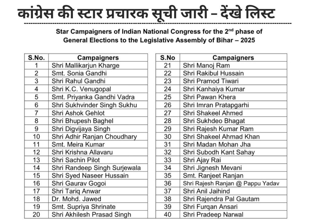 बिहार :– विधानसभा चुनाव के पहले चरण के लिए नामांकन प्रक्रिया पूरी हो चुकी है। इसके साथ ही राजनीतिक दलों ने अपने स्टार प्रचारकों की सूची जारी कर दी है। कांग्रेस और आरजेडी दोनों की ओर से 40–40 स्टार प्रचारकों के नाम तय किए गए हैं।