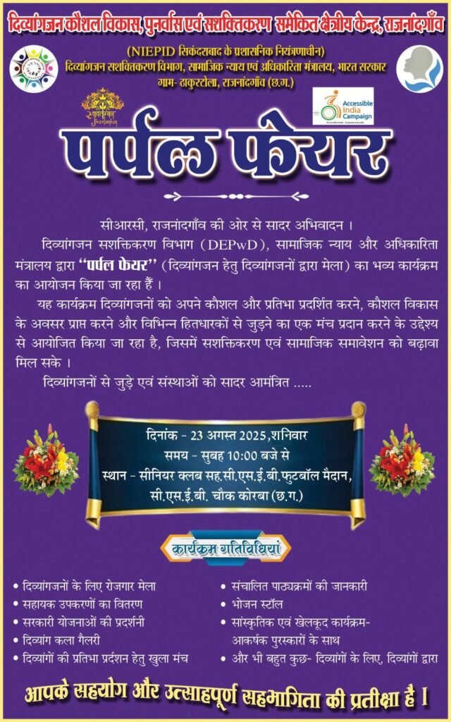 छत्तीसगढ़:–दिव्यांगजन सशक्तिकरण विभाग (DEPwD), सामाजिक न्याय एवं अधिकारिता मंत्रालय, भारत सरकार के द्वारा “पर्पल फेयर” का आयोजन दिनांक 23 अगस्त 2025, शनिवार को प्रातः 10:00 बजे से किया जा रहा है। यह आयोजन सीनियर क्लब सह.सी.एस.ई.बी. फुटबॉल मैदान, सी.एस.ई.बी. चौक, कोरबा (छ.ग.) में संपन्न होगा।