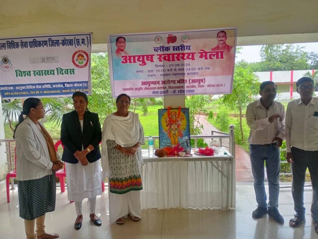 कोरबा / न्यायालय परिषद में तालुका विधिक सेवा प्राधिकरण कटघोरा एवं विभाग के संयुक्त तत्वाधान में आयुष स्वास्थ्य मेला का भव्य आयोजन किया गया न्यायाधीशों द्वारा आयुर्वेद के प्रणेता भगवान धनवंत री के तेल चित्र पर पुष्प अर्पण कर विशेष आयुष शिविर का शुभारंभ किया गया इस स्वास्थ्य मेले का उद्देश्य ग्रामीण अंचलों में स्वास्थ्य जागरूकता को बढ़ावा एवं आमजन को निशुल्क उपचार एवं परामर्श उपलब्ध कराना रहा।