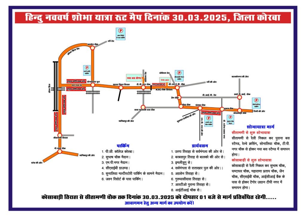 कोरबा/ जिले में हिंदू नववर्ष शोभा यात्रा का आयोजन 30 मार्च 2025 को किया जाएगा। इस यात्रा के लिए एक निर्धारित रूट मैप तैयार किया गया है, जो संलग्न किया गया है।