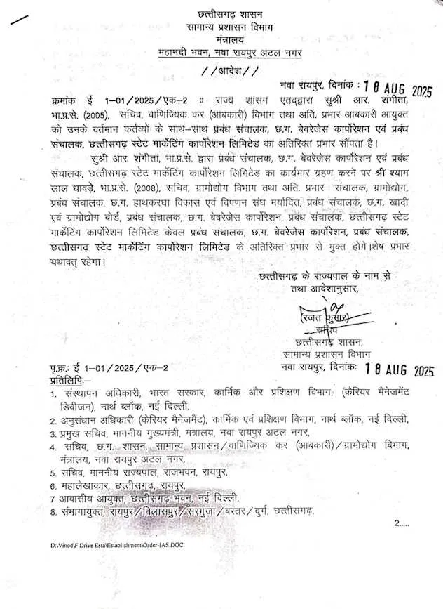 आर. शंगीता के कार्यभार ग्रहण करने के बाद IAS श्याम लाल धावड़े को इन दोनों निगमों के प्रबंध संचालक पद से मुक्त कर दिया गया है। हालांकि, उनके पास ग्रामोद्योग विभाग सचिव, संचालक ग्रामोद्योग, छग हाथकरघा विकास संघ और खादी ग्रामोद्योग बोर्ड का प्रभार यथावत रहेगा।