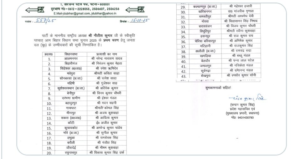 JDU ने जारी की 57 प्रत्याशियों की पहली लिस्ट, देखें इन नेताओं को मिला टिकट…