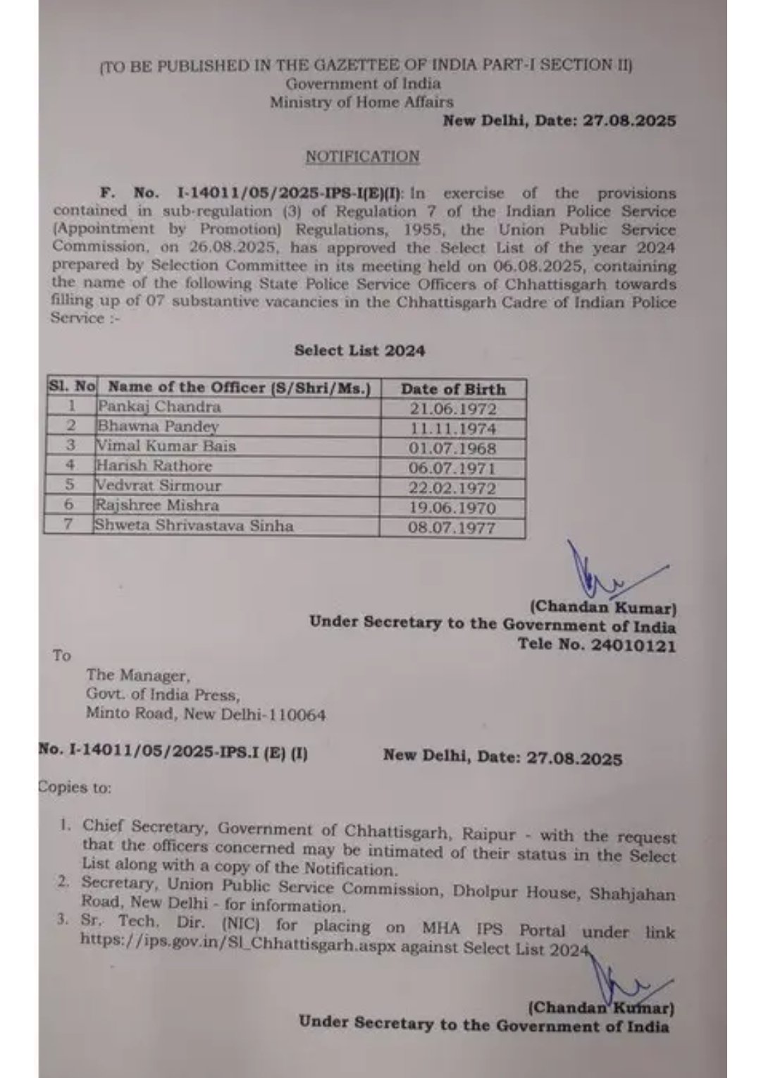 छत्तीसगढ़ :– राज्य पुलिस सेवा के सात अधिकारियों को भारतीय पुलिस सेवा कैडर में पदोन्नत किया गया। गृह मंत्रालय ने इसकी आधिकारिक अधिसूचना जारी कर दी है।