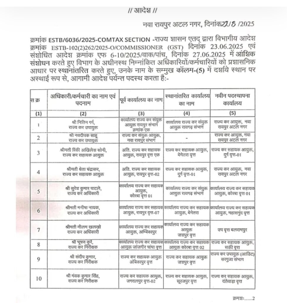 छत्तीसगढ़ :– GST विभाग में आज बड़ा फेरबदल किया गया है। शासन ने 23 जून और 27 जून 2025 को जारी आदेशों में आंशिक संशोधन करते हुए 10 अधिकारियों और कर्मचारियों की नई पदस्थापना सूची जारी कर दी है।