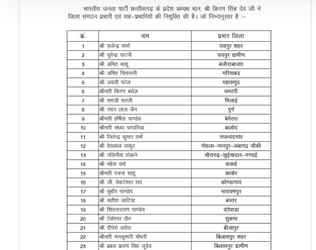 छत्तीसगढ़ :– भारतीय जनता पार्टी (BJP) ने संगठन विस्तार में बड़ा फेरबदल किया है। प्रदेश अध्यक्ष किरण देव सिंह के नेतृत्व में 36 विधानसभाओं के लिए नए प्रभारी नियुक्त किए गए हैं। इसके साथ ही जिलों के लिए 40 प्रभारी और सह प्रभारियों की सूची भी जारी की, वहीं अब 17 प्रकोष्ठों के लिए संयोजक और सह संयोजकों का भी ऐलान किया है। इसके साथ ही संगठन प्रभारी और सह प्रभारियों की नियुक्ति भी की गई है।