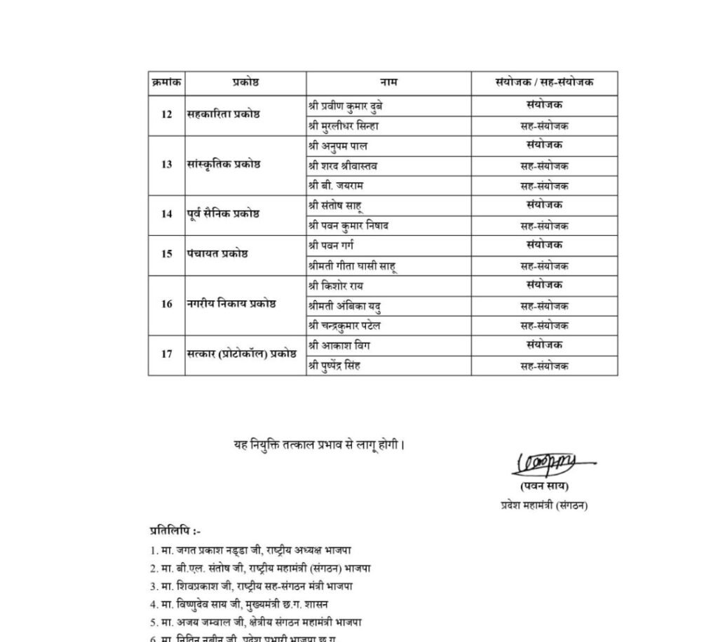 प्रदेश संगठन महामंत्री पवन साय ने नया आदेश जारी करते हुए 17 प्रकोष्ठों के लिए संयोजक और सह संयोजकों का ऐलान किया है, जिसमें 41 दिग्गज नेताओं को अहम जिम्मेदारी दी गई है। ये प्रकोष्ठ पार्टी के विभिन्न मोर्चों को मजबूत बनाने के लिए रणनीतिक रूप से नियुक्त किए गए हैं, जो पार्टी को आगामी चुनावों में मजबूती देंगे। इस संगठनात्मक विस्तार से बीजेपी छत्तीसगढ़ में अपनी पकड़ और बढ़ा सकेगी।