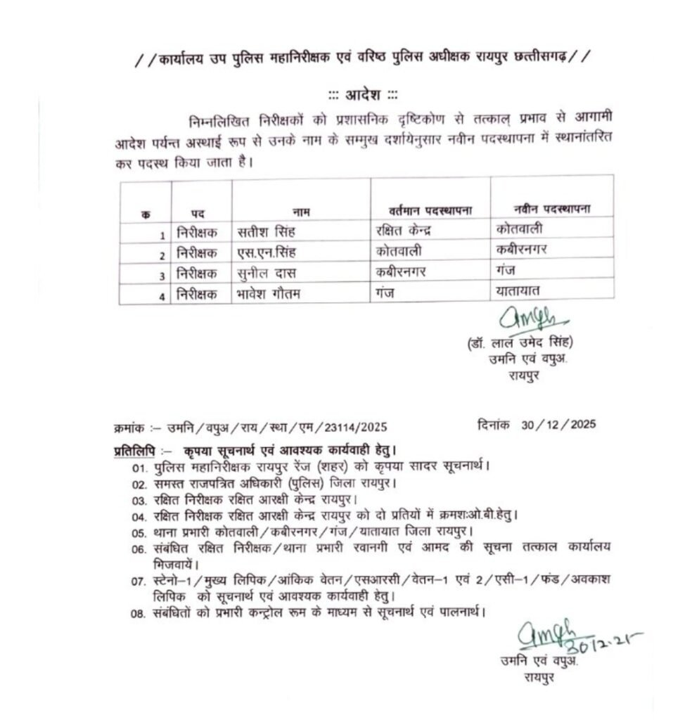 छत्तीसगढ़ :– रायपुर जिले में साल के अंतिम दिन पुलिस महकमे में बड़ा प्रशासनिक फेरबदल किया गया है। रायपुर एसएसपी डॉ. लाल उमेद सिंह ने आदेश जारी करते हुए टीआई से लेकर एएसआई स्तर के कुल 119 पुलिस अधिकारियों का तबादला किया है, साथ ही सभी को नई पदस्थापना भी दी गई है।