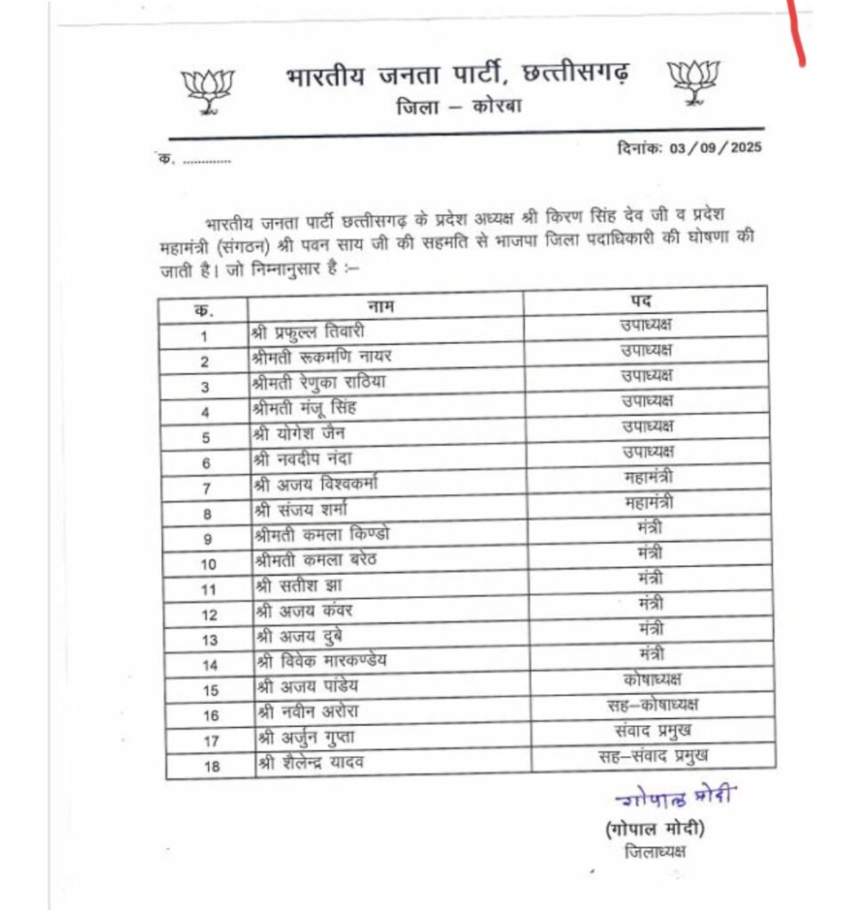 कोरबा :– भाजपा भारतीय जनता पार्टी छत्तीसगढ़ के प्रदेश अध्यक्ष किरण देव और प्रदेश संगठन महामंत्री पवन साय की सहमति से भाजपा जिला कोरबा के पदाधिकारियों की नई घोषणा कर दी गई है। इस नई टीम में उपाध्यक्ष, महामंत्री, मंत्री और कोषाध्यक्ष सहित कुल 18 पदाधिकारी शामिल हैं।
