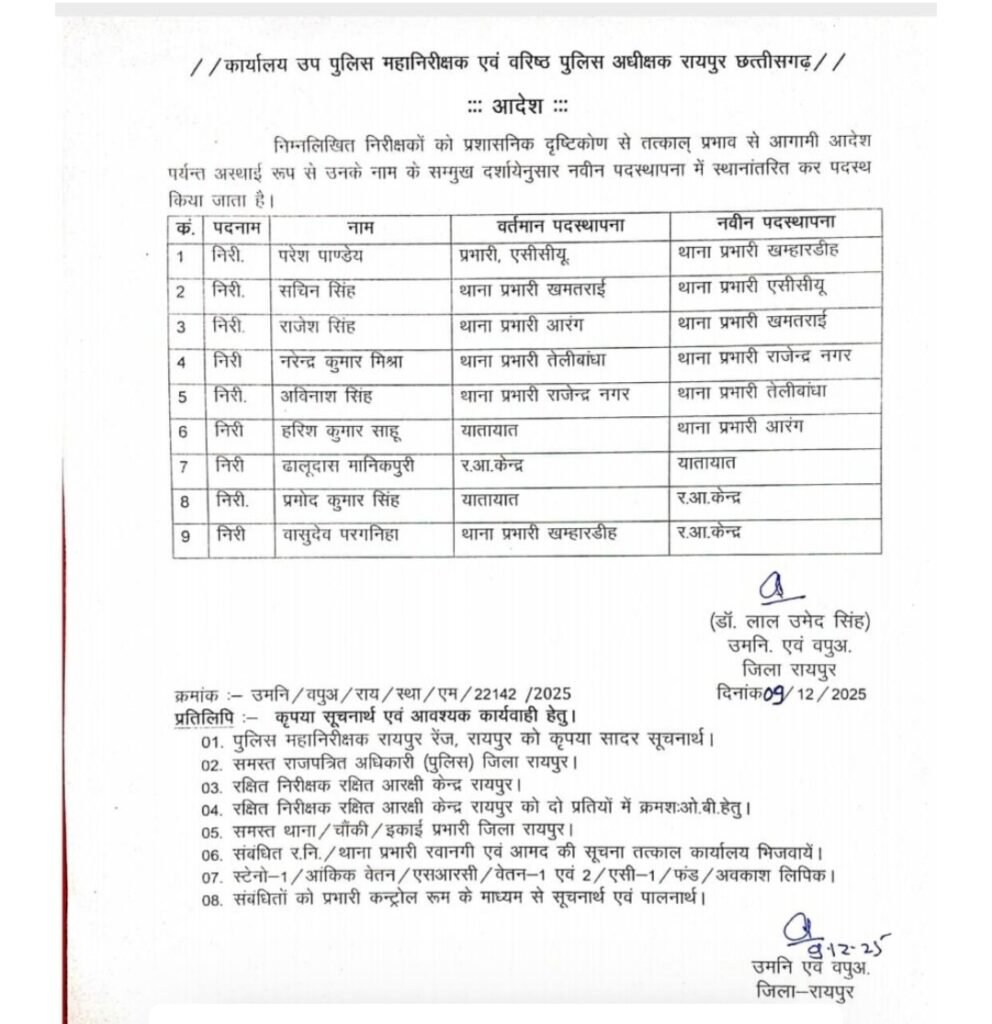 छत्तीसगढ़ :– पुलिस विभाग में बड़ा फेरबदल किया गया है। पुलिस अधीक्षक ने देर रात रायपुर जिले के पांच थाने और अन्य प्रकोष्ठ के प्रभारियों का तबादला किया है। इस जारी आदेश में खमतराई, आरंग, तेलीबांधा, खम्हारडीह और राजेंद्र नगर थाना शामिल है। साथ ही एसीसीयू के प्रभारी भी हटा दिए गए है।