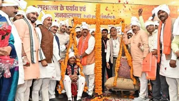 छत्तीसगढ़:–:मुख्यमंत्री विष्णु देव साय ने कहा कि अन्नदाता देश की अर्थव्यवस्था की मजबूत रीढ़ है और किसानों की समृद्धि और खुशहाली से ही विकसित भारत का सपना साकार होगा। मुख्यमंत्री से आज उनके निवास कार्यालय में प्रदेश के किसानों ने सौजन्य मुलाकात की और कृषक उन्नति योजना के माध्यम से धान के अंतर की 10 हजार करोड़ रुपए से अधिक की राशि होली से पूर्व किसानों के खातों में अंतरित करने की घोषणा पर आभार व्यक्त किया। इस अवसर पर किसानों ने मुख्यमंत्री को धान से तौलकर प्रदेश के अन्नदाताओं की ओर से अभिनंदन किया।