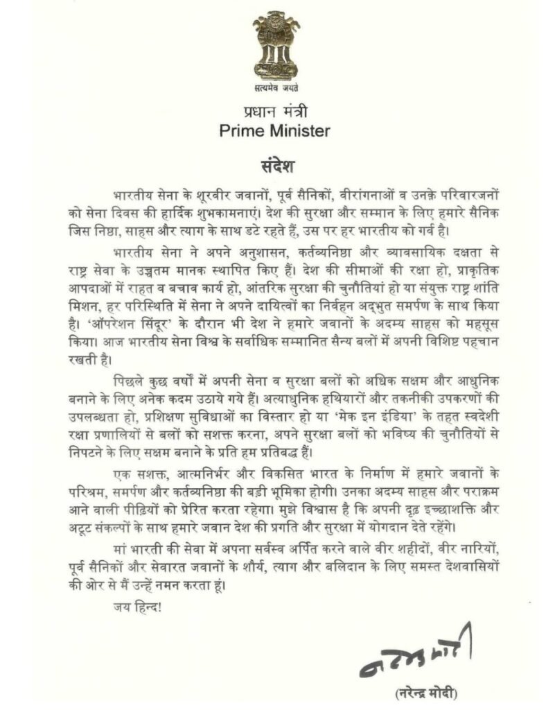 उस पर हर भारतीय को गर्व है; प्रधानमंत्री ने अपने संदेश में कहा कि भारतीय सेना ने अनुशासन, कर्तव्यनिष्ठा और व्यावसायिक दक्षता से राष्ट्र सेवा के उच्चतम मानक स्थापित किए हैं, चाहे वह सीमाओं की रक्षा हो, प्राकृतिक आपदाओं में राहत-बचाव कार्य हो,