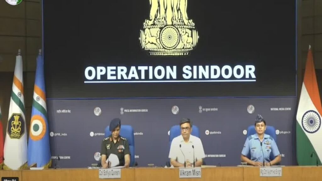 नई दिल्ली:- जम्मू कश्मीर के पहलगाम में हुए भीषण आतंकी हमले के बाद भारत ने पाकिस्तान अधिकृत कश्मीर में कड़ी कार्रवाई और 9 आतंकी ठिकानों पर मिसाइल स्ट्राइक की. इस एक्शन को ‘ऑपरेशन सिंदूर’ नाम दिया गया है. इस ऑपरेशन को भारतीय सेना, वायुसेना और नौसेना ने संयुक्त रूप से अंजाम दिया है. इस संबंध में विदेश सचिव विक्रम मिस्री जानकारी दे रहे हैं. उनके साथ दो युवा महिला अधिकारी कर्नल सोफिया कुरैशी और विंग कमांडर व्योमिका सिंह भी मौजूद हैं.