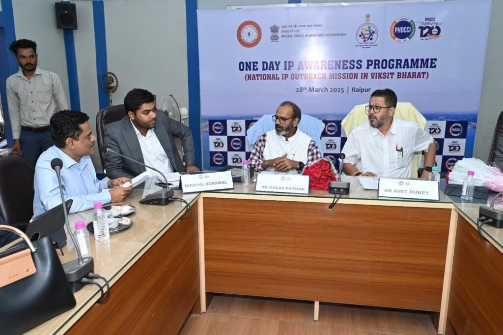 रायपुर:- पीएचडीसीसीआई ने लघु और मध्यम उद्यम मंत्रालय, भारत सरकार के विकास आयुक्त कार्यालय के सहयोग से “एक दिवसीय बौद्धिक संपदा (IP) जागरूकता कार्यक्रम” (नेशनल IP आउटरीच मिशन – विकसित भारत) का आयोजन 28 मार्च 2025 को IGKV डायरेक्टर रिसर्च सर्विसेज, IGKV, कृषक नगर, रायपुर (छत्तीसगढ़) में किया। इस कार्यशाला में डॉ. हुलास पाठक (प्रिंसिपल इन्वेस्टिगेटर एवं CEO, RKVY RAFTAAR एग्री-बिजनेस इनक्यूबेटर, IGKV) एवं डॉ. अमित दुबे (वैज्ञानिक, छत्तीसगढ़ विज्ञान एवं प्रौद्योगिकी परिषद, छत्तीसगढ़ सरकार) ने अपनी गरिमामयी उपस्थिति दर्ज कराई।