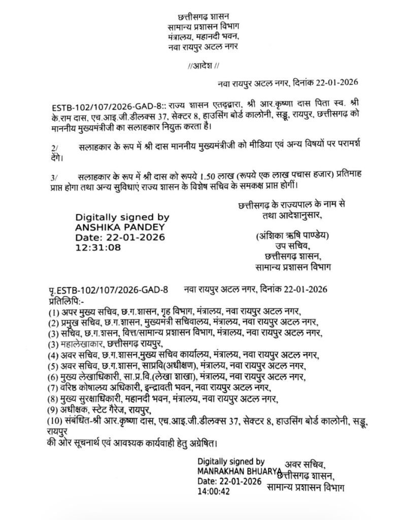 छत्तीसगढ़ :– सरकार ने मीडिया विशेषज्ञ आर. कृष्णा दास को मुख्यमंत्री विष्णुदेव साय का सलाहकार नियुक्त किया है। इस संबंध में सामान्य प्रशासन विभाग द्वारा आदेश जारी कर दिया गया है। जारी आदेश के अनुसार आर. कृष्णा दास मुख्यमंत्री को मीडिया एवं अन्य विषयों पर परामर्श देंगे। उन्हें सलाहकार के रूप में प्रतिमाह 1 लाख 50 हजार रुपये मानदेय प्रदान किया जाएगा। साथ ही अन्य सुविधाएं राज्य शासन के विशेष सचिव के समकक्ष होंगी।