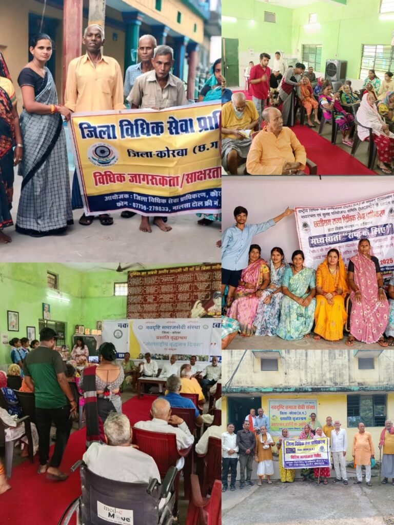 कोरबा/ श्री संतोष शर्मा जिला सत्र न्यायाधीश अध्यक्ष जिला विधिक सेवा प्राधिकरण कोरबा के निर्देशन एवं सचिव कुमारी डिंपल के मार्गदर्शन अंतर्राष्ट्रीय वृद्धजन दिवस पर जिला विधिक सेवा प्राधिकरण कोरबा ने जिला एवं विभिन्न तालुका क्षेत्रों में वरिष्ठ नागरिकों के सम्मान और उनके विधिक अधिकारों पर जागरूकता का बिगुल फूंक का अलग-अलग तालुका के भिन्न-भिन्न कार्यक्रमों बड़ी संख्या में बुजुर्ग समाजसेवी विद्यार्थी और अधिकारी सम्मिलित हुए।