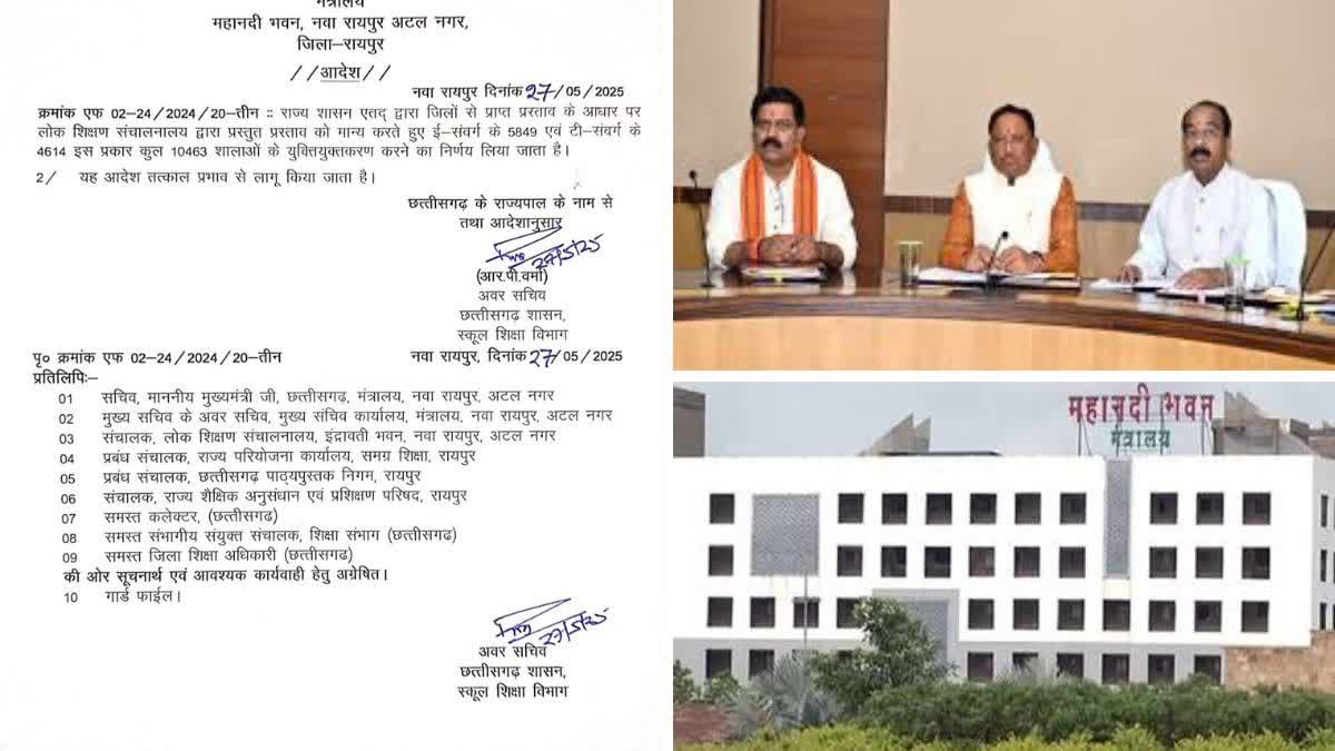 रायपुर:- छत्तीसगढ़ में युक्तियुक्तकरण की प्रक्रिया तेज हो गई है. पहले चरण में स्कूलों का युक्तियुक्तकरण किया जा रहा है. इस संबंध में स्कूल शिक्षा विभाग की तरफ से आदेश जारी कर दिया गया है. तय समय सारणी के अनुसार स्कूलों के युक्ति उपकरण की प्रक्रिया चल रही है. स्कूल शिक्षा विभाग की तरफ से जारी आदेश के अनुसार कुल 10 हजार 443 स्कूलों का युक्तिकरण किया जाएगा. जिसमें ई संवर्ग के 5849 और टी संवर्ग के 4614 स्कूल शामिल है.