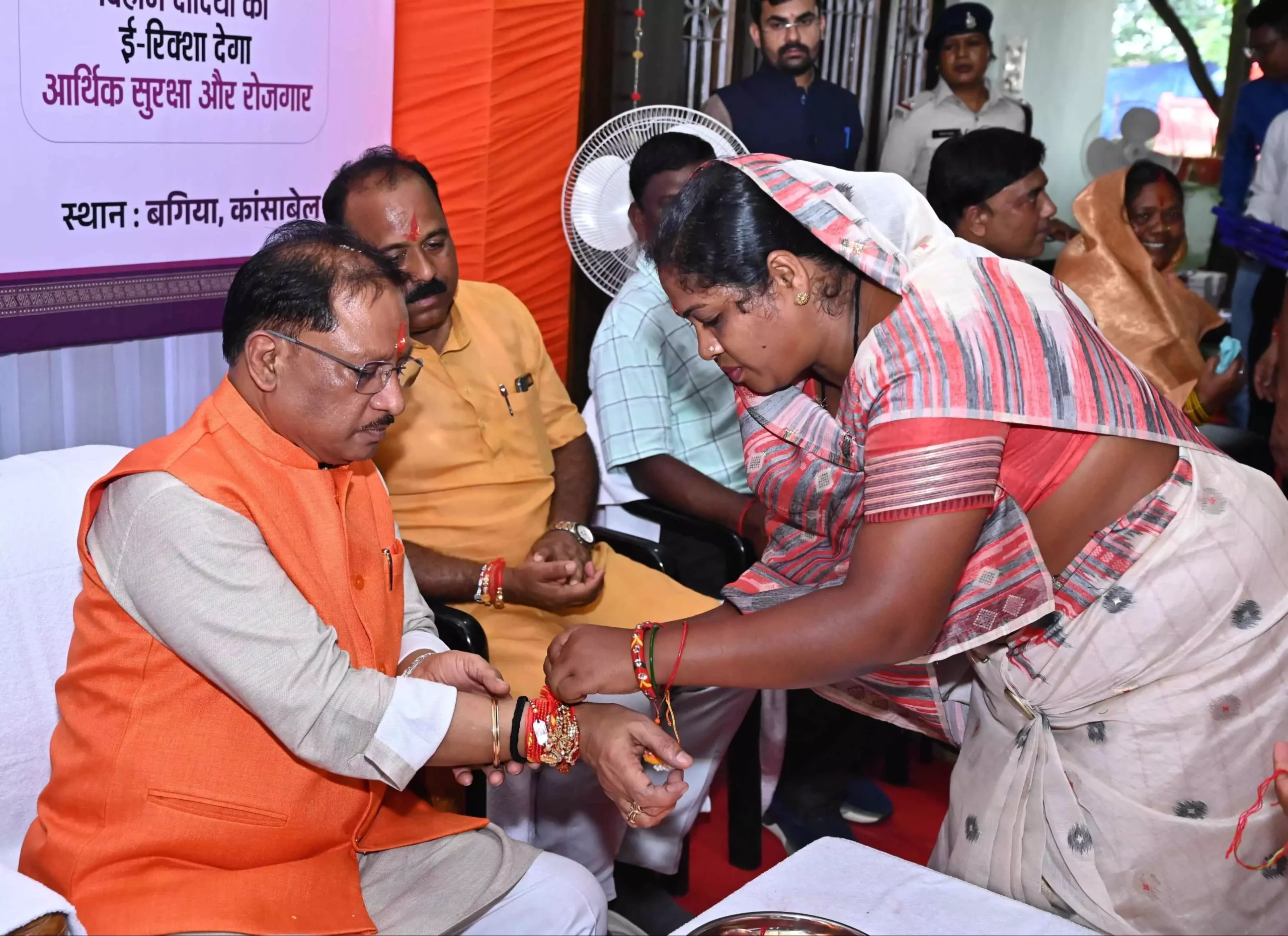 रायपुर:- मुख्यमंत्री विष्णु देव साय के गृह ग्राम बगिया स्थित कैंप कार्यालय में रक्षाबंधन के अवसर पर विभिन्न योजनाओं से लाभान्वित बहनों ने राखी बांधकर आभार व्यक्त किया। प्रधानमंत्री आवास योजना, महतारी वंदन योजना की हितग्राही दीदियों के साथ आंगनबाड़ी कार्यकर्ता-सहायिकाएँ, मितानिन और स्व-सहायता समूह की बहनों ने भी मुख्यमंत्री श्री साय की कलाई पर राखी बांधी और उनके दीर्घायु की कामना की। मुख्यमंत्री श्री साय ने सभी बहनों को रक्षाबंधन की हार्दिक बधाई देते हुए कहा कि यह पर्व भाई-बहन के अटूट रिश्ते, स्नेह और सम्मान का प्रतीक है। उन्होंने कहा कि सरकार छत्तीसगढ़ की तीन करोड़ जनता के विकास के लिए निरंतर कार्य कर रही है.