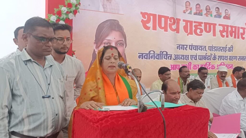 कवर्धा :- कबीरधाम जिले के पंडरिया विधानसभा क्षेत्र के पंडरिया नगर पालिका एवं नगर पंचायत पांडातराई में शपथ ग्रहण कार्यक्रम रखा गया था. कार्यक्रम में मुख्य अतिथि के रूप में पंडरिया विधायक भावना बोहरा शामिल हुईं. इस दौरान बीजेपी कार्यकर्ता, निवार्चित जनपद एवं जिला पंचायत सदस्य और बड़ी संख्या में स्थानीय लोग मौजूद रहे. नगर पंचायत पांडातराई के वन निर्वाचित अध्यक्ष सरिता सोनी और 07 बीजेपी समेत दो निर्दलीय पार्षदों ने शपथ ली.