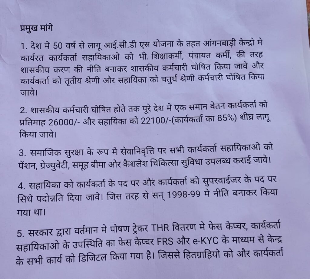 “हम मातृशक्ति जो राज्य की हर कोने में बच्चों और माताओं की देखभाल में दिन-रात जुटी हैं लेकिन उचित मानदेय और सम्मान नहीं मिलता सरकार को चाहिए कि हमारी सेवा को संविदा नहीं बल्कि स्थाई सेवा के रूप में मान्यता दे”।
