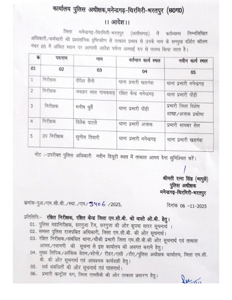 छत्तीसगढ़:– भरतपुर जिले के कई पुलिसकर्मियों का ट्रांसफर आदेश जारी किया गया है। पुलिस अधीक्षक रत्ना सिंह ने गुरुवार को कई थाना प्रभारियों के स्थानांतरण के आदेश जारी किए। जारी आदेश में 4 निरीक्षक और एक उप निरीक्षक के नाम शामिल है।