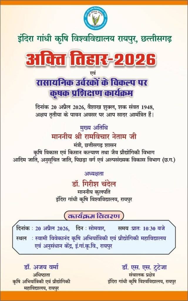 इंदिरा गांधी कृषि विश्वविद्यालय में अक्षय तृतीया के अवसर पर कल ‘‘अक्ती तिहार’’ का आयोजन किया जा रहा है। स्वामी विवेकानंद कृषि अभियांत्रिकी महाविद्यालय एवं अनुसंधान केन्द्र के पास स्थित प्रक्षेत्र में प्रातः 10ः30 बजे से आयोजित राज्य स्तरीय अक्ती तिहार समारोह के मुख्य अतिथि कृषि मंत्री श्री रामविचार नेताम होंगे। समारोह की अध्यक्षता इंदिरा गांधी कृषि विश्वविद्यालय के कुलपति डॉ. गिरीश चंदेल करेंगे। अक्षय तृतीया के अवसर पर धरती माता एवं बीजों की पूजा-अर्चना कर बीज बुआई का कार्य प्रतीकात्मक रूप से किया जाएगा। कृषि मंत्री श्री नेताम द्वारा प्रगतिशील कृषकों को कृषि आदान सामग्री का वितरण किया जाएगा। इस अवसर पर किसानों के लिए नवीन बीज बुआई तकनीकी एवं कृषि में ड्रोन का उपयोग तकनीक का प्रदर्शन भी किया जाएगा। कृषि विज्ञान केंन्द्र रायपुर द्वारा इस अवसर पर “रासायनिक उर्वरकों का विकल्प” विषय पर कृषक प्रशिक्षण कार्यक्रम का आयोजन भी किया गया है। अक्ती तिहार का आयोजन इंदिरा गांधी कृषि विश्वविद्यालय के अंतर्गत संचालित समस्त महाविद्यालयों, कृषि विज्ञान केन्द्रां एवं अनुसंधान केन्द्रों में भी किया जाएगा।