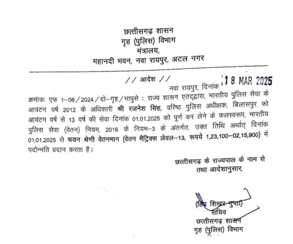 छत्तीसगढ़ शासन ने इस त्रुटि को संज्ञान में लेते हुए 18 मार्च 2025 को संशोधित आदेश जारी कर रजनेश सिंह को चयन श्रेणी वेतनमान (लेवल-13) में पदोन्नति प्रदान की है। उनके वेतनमान को Rs 1,23,100 – Rs 2,15,900 के स्तर पर स्वीकृत किया गया है। यह आदेश गृह (पुलिस) विभाग के सचिव हिम शिखर गुप्ता द्वारा जारी किया गया।