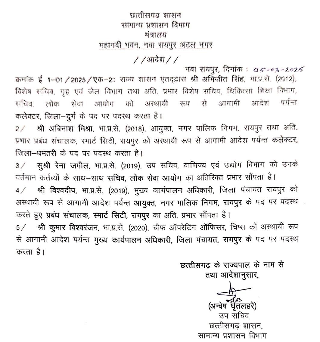 रायपुर :- अभिजीत सिंह दुर्ग के बनाए गए कलेक्टर,