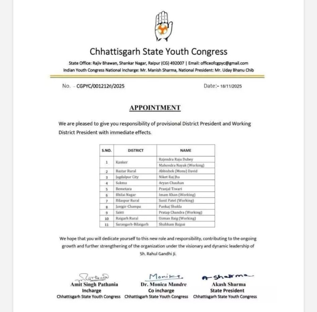 छत्तीसगढ़ :– युवा कांग्रेस ने संगठनात्मक ढांचे में बड़ा फेरबदल करते हुए बुधवार को जिला अध्यक्षों की नई सूची जारी की है। कुल 11 जिलों में नए जिलाध्यक्ष नियुक्त किए गए हैं, जिनमें कई युवा चेहरों को मौका दिया गया है।
